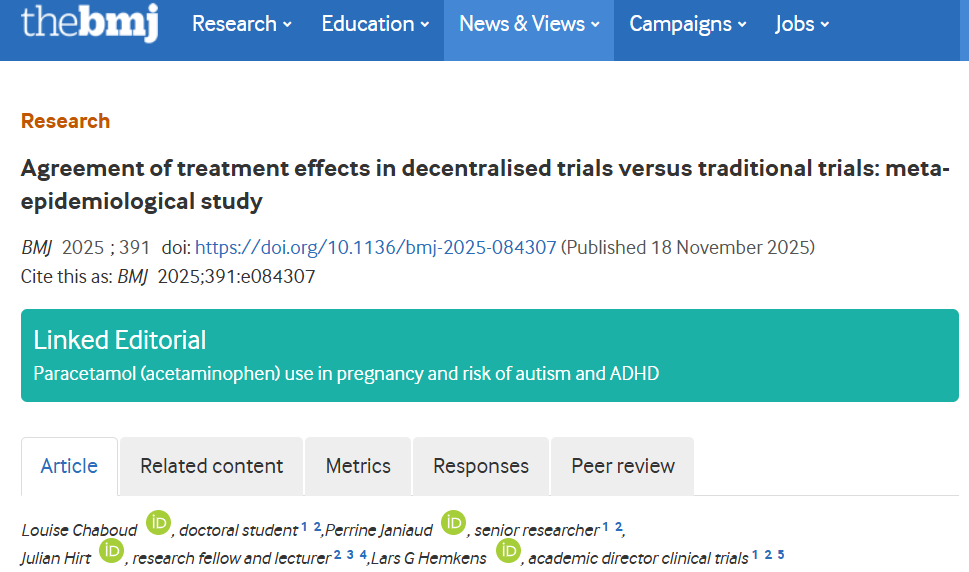 Chaboud L., Janiaud P., Hirt J., Hemkens L. Agreement of treatment effects in decentralised trials versus traditional trials: meta-epidemiological study BMJ – November 2025