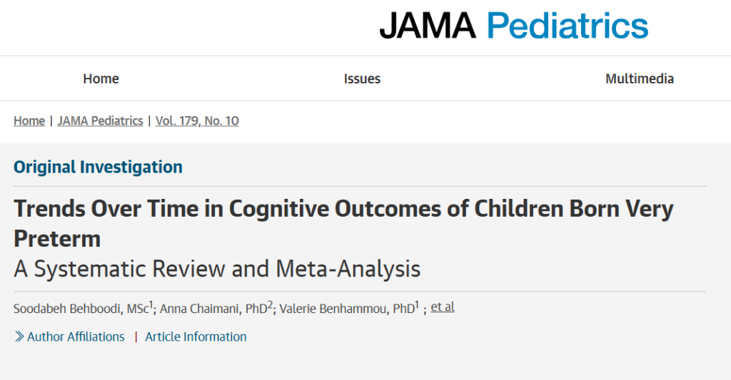 Behboodi S., Chaimani A., Benhammou V., et al. Trends Over Time in Cognitive Outcomes of Children Born Very Preterm: a systematic review and meta-analysis JAMA Pediatrics – July 2025