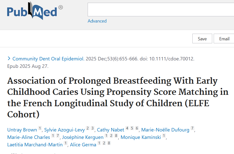 Brown U., Azogui-Levy S., Nabet C., Dufourg M-N, Charles M-A, Kerguen J., Kaminski M., Marchand-Martin L., Germa A. Association of Prolonged Breastfeeding With Early Childhood Caries Using Propensity Score Matching in the French Longitudinal Study of Children (ELFE Cohort) Community Dentistry and Oral Epidemiology – August 2025